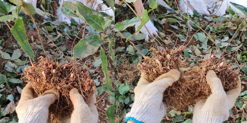 通過對采挖的淫羊藿種苗進行觀察,分蘗芽多且飽滿,證實此地適宜淫羊藿的種植。在項目組成員和當地藥農的共同努力下,兩天完成了約三畝淫羊藿種苗的采挖工作。