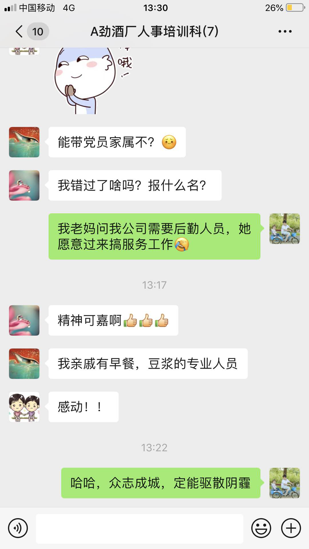 勁牌酒廠人事培訓(xùn)科胡海燕經(jīng)理在收到征集通知后,立即轉(zhuǎn)發(fā)到廠中層干部群里。一時間各車間、部門報名的信息很快反饋了上來。胡經(jīng)理表示,作為本地的生產(chǎn)大廠,本地員工多,理應(yīng)分擔(dān)一份責(zé)任。報名截止后,勁牌酒廠有164人報名參加志愿者。2018年優(yōu)秀家庭獲得者、勁牌酒廠向輝洪報名參加了志愿者,他愛人是醫(yī)生,此時奮戰(zhàn)在抗疫第一線。向輝洪的媽媽還想來公司做后勤服務(wù)的志愿者,托兒子詢問。像這樣支持勁牌預(yù)防藥生產(chǎn)工作的家屬還有很多。